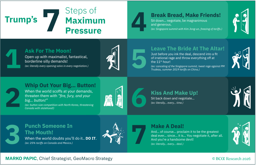 Some people might describe President Trump’s tactic using the TACO — Trump Always Chickens Out — acronym. Instead, BCA Research’s Marko Papic put together a seven-step framework for Trump’s maximum pressure negotiating style that we find more instructive.