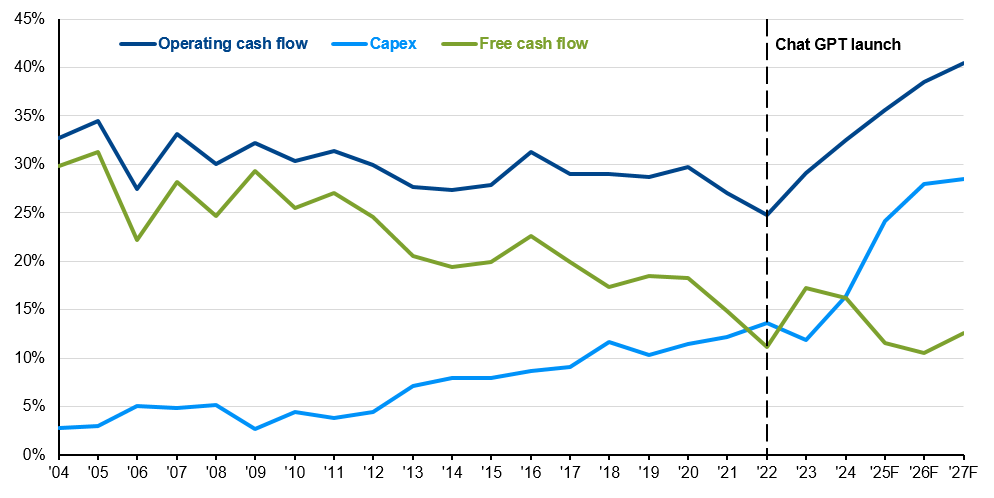 A Stronger Starting Line-Up Unlike the fragile startups of the dotcom era, today’s main AI spenders are profitable, cash-printing businesses. They are self-funding a massive AI arms race with capital expenditures set to leap by 60%, from $250bn in 2025 to over $400bn in 2026. Operating cash flows continue to outspace AI spend as a percentage of sales, allowing this historic investment to feel like a strategic augmentation of their core businesses rather than a reckless gamble.
